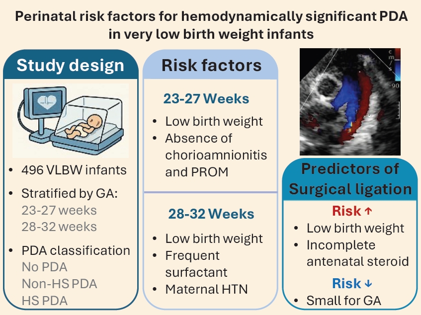 Finding: Lower birth weight, frequent surfactant treatment, and maternal hypertension increased hemodynamically significant PDA risk in very low birth weight infants, whereas chorioamnionitis and premature rupture of membranes protected against it. A lower birth weight and incomplete antenatal steroid use increased the risk of surgical ligation, whereas small for gestational age reduced it.