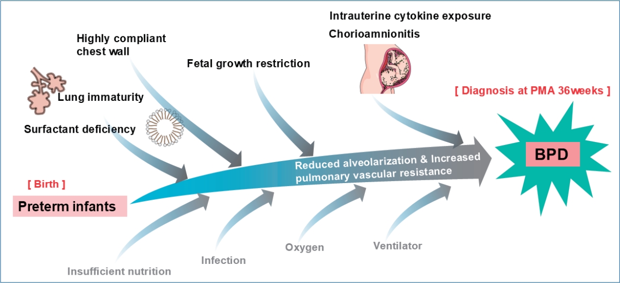 The definition of bronchopulmonary dysplasia (BPD) has continued to evolve. Recently, newer definitions based on respiratory support at 36 weeks’ postmenstrual age better predict long-term outcomes but diagnose BPD relatively late. To address this limitation, the New Japanese Classification uses early postnatal factors, including small for gestational age and bubbly or cystic chest radiographic findings, to predict severe BPD and enable early targeted interventions.