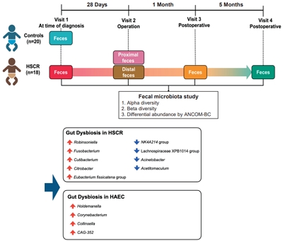 Finding: Patients with HSCR showed gut dysbiosis with reduced diversity. Postoperative microbial changes included increased alpha diversity. Certain taxa, such as Eubacterium and Collinsella, were associated with recovery or HAEC.