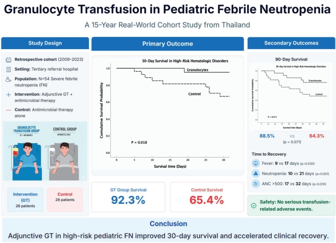 Finding: In this 15-year real-world cohort, granulocyte transfusion significantly increased 30-day survival (92.3 % vs. 65.4%; adjusted odds ratio, 0.105; P=0.020) and accelerated fever and neutrophil recovery without serious adverse events.