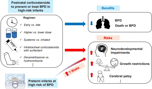 Postnatal corticosteroids facilitate ventilator weaning and reduce the risk of bronchopulmonary dysplasia (BPD). Despite being commonly used in high-risk infants, administration guidelines have not been established. Early dexamethasone may cause neurodevelopmental harm, and the optimal dosing remains uncertain. Inhaled corticosteroids show inconclusive benefits, whereas intratracheal administration with surfactant appears promising. Thus, corticosteroids should be used cautiously in high-risk, ventilator-dependent infants with severe BPD, and further high-quality trials are needed.