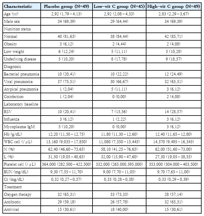 A total of 150 patients were recruited, 1 patient was excluded due to renal insufficiency, and 6 patients were withdrawn (3 voluntarily withdrew and 3 were diagnosed with a different pulmonary disease). Consequently, 143 patients were included in the final analysis and were divided into 3 groups: 49 in the placebo group, 45 in the low-vit C group, and 49 in the high-vit C group (Fig. 1). The median age of patients in the placebo group was 2.92 years, in the low-vit C group it was also 2.92 years, and in the high-vit C group was 2.83 years. There were 97 male patients and 46 female patients, and 120 participants had normal nutrition status. Of the 99 patients diagnosed with viral pneumonia, 37 were in the placebo group, 30 in the low-vit C group and 32 in the high-vit C group. Also, 32 patients were diagnosed with bacterial pneumonia and these were distributed as 10 in the placebo group, 10 in the low-vit C group and 12 in the high-vit C group. In screening for other viral infections, respiratory syncytial virus (RSV) was found in 20.41% of the patients in the placebo group, 15.56 % in the low-vit C group and 28.57 % in the high-vit C group at enrollment. Oxygen therapy; mainly oxygen corrugate, was needed for more than 50% of the patients in each group. Other baseline characteristics were the same for all 3 groups, except for white blood counts which was found to be lower in the low-vit C group than the other groups (Table 1).