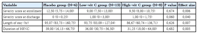 Subgroup analysis of the patients who required a high-flow nasal cannula indicated that these patients had a higher clinical severity score than all other patients in all groups. The median length of stay in the high-vit C group was 86.67 hours and 93.75 hours in the low-vit C group. Both times were shorter than the placebo group (95.07 hours). The values and differences were not statistically significant. Also, the duration of the need for a high-flow nasal cannula was shorter in both the high-vit C group and low-vit C group than in the placebo group, with no statistical significance demonstrated by those values (Table 3).