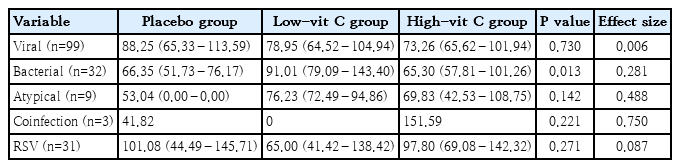 In each subgroup of diagnoses of viral pneumonia and RSV pneumonia, both the high-vit C group and low-vit C group demonstrated a reduced length of stay, shorter than the placebo group. However, again, there was no statistical significance in those differences (P=0.730). For those patients diagnosed with bacterial pneumonia, the length of stay of the high-vit C group was 65.30 hours, for the low-vit C group it was 91.01 hours and for the placebo group (66.35 hours). These values indicate that the low vitamin C supplement did not help the length of stay in bacterial pneumonia. (Table 4).