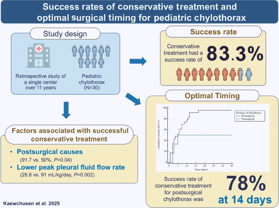 Pediatric chylothorax poses management challenges, with conservative treatment as the first-line approach and surgery reserved for persistent cases. However, data remain limited on factors related to conservative treatment success and optimal surgical timing.