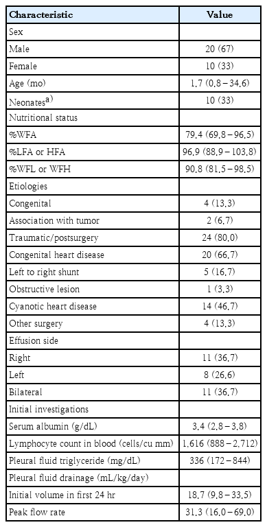 A total of 30 patients diagnosed with chylothorax were included in the present study, of whom 20 (67%) were male. The median age was 1.7 months (IQR, 0.8–34.6 months). Postsurgical chylothorax was the primary etiology, accounting for 24 of 30 cases (80%). Among these, 20 patients underwent cardiac surgery for congenital heart diseases, while the remaining 4 cases involved diaphragmatic plication, tracheoesophageal fistula repair, catheterization for cerebral glue embolization, and open thoracic extracorporeal membrane oxygenation cannulation.
