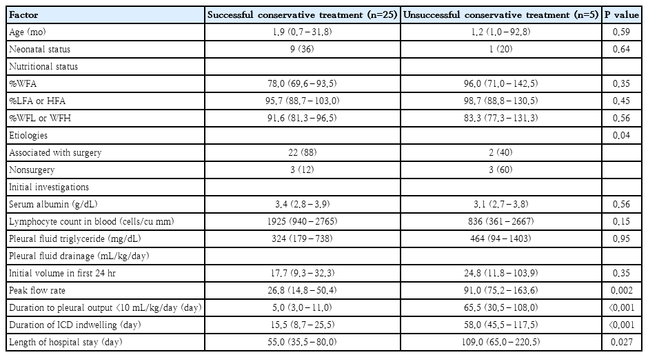 Characteristics of successful versus unsuccessful conservative treatment groups of pediatric patients with chylothorax