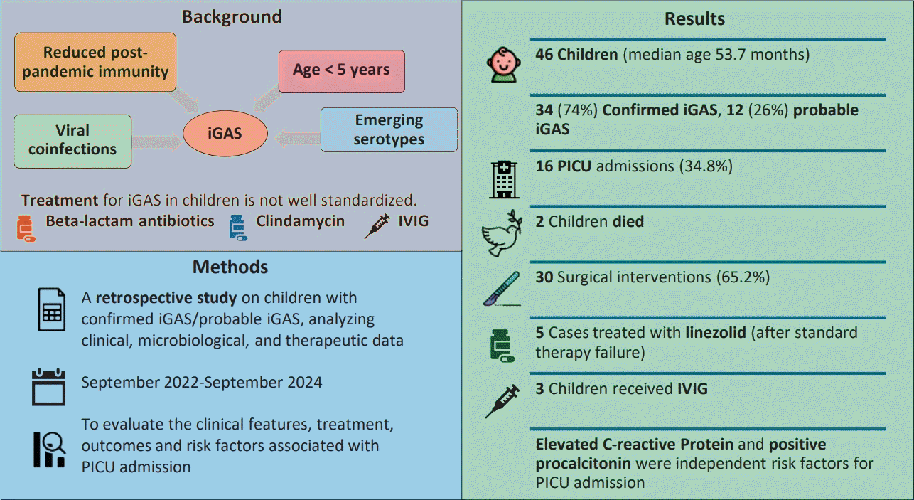 Forty-six children with confirmed/probable iGAS (median age, 53.7 months) were included. Of them, 34 (73.9%) had confirmed iGAS and 12 (26.1%) had probable iGAS. Sixteen children (34.8%) with iGAS were admitted to the PICU; of them, 2 died. All children received beta-lactam antibiotics; in 5 cases (10.9%), linezolid was administered after beta-lactam and clindamycin therapy failure. Thirty patients (65.2%) underwent surgery. Of the study population, 22% had preexisting conditions and 17% had viral respiratory coinfections. Elevated C-reactive protein and procalcitonin levels were independent risk factors for PICU admission. IVIG administered to 3 patients had varying outcomes.