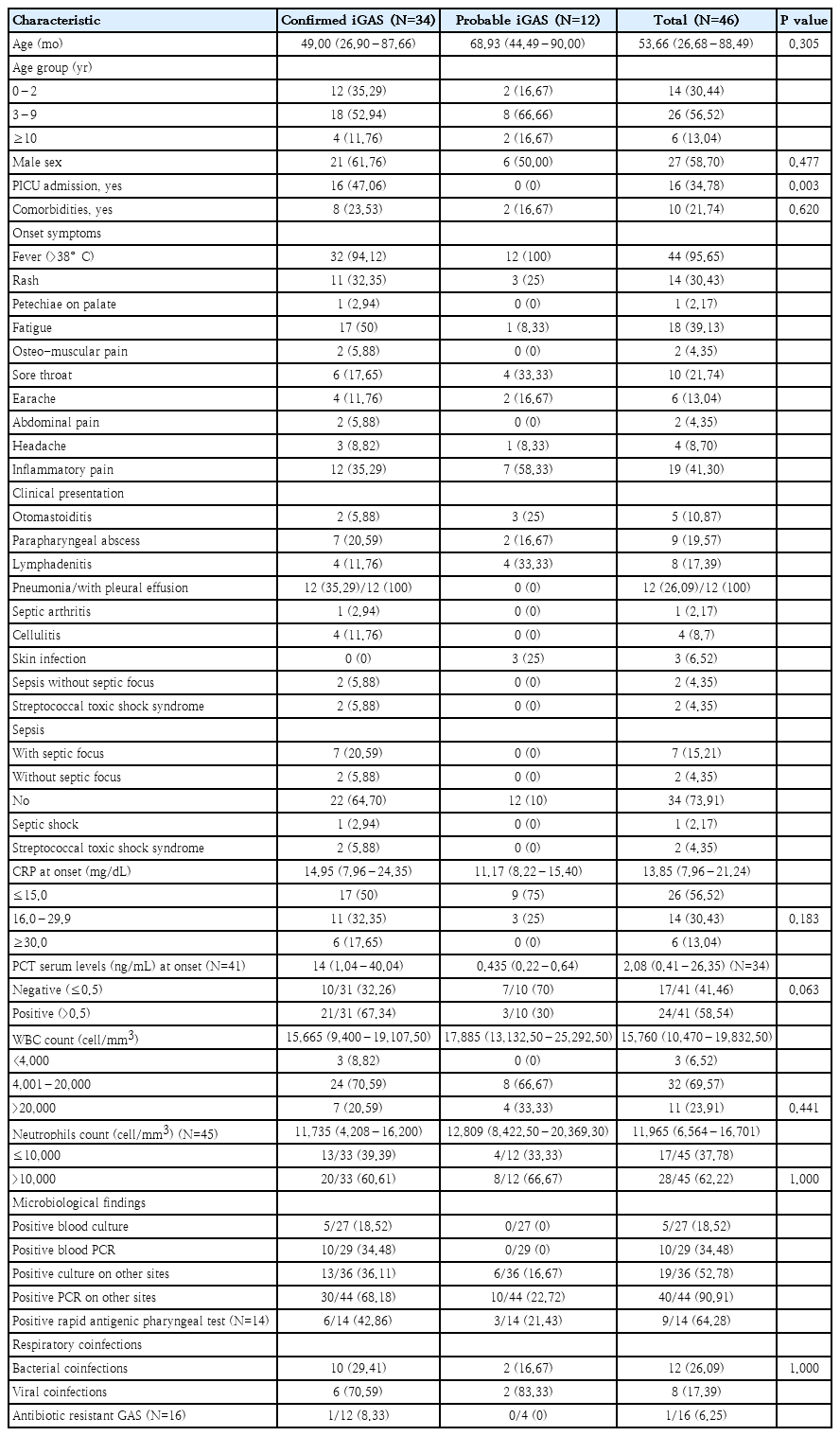 Forty-six children with confirmed/probable iGAS were included (median age, 53.66 months; IQR, 29.68–88.49 months; 27 males [58.70%] and 19 females [41.30%]): 34 confirmed iGAS (73.91%) and 12 probable iGAS (26.09%). Sixteen patients (34.78%) with iGAS were admitted to PICU, 2 children died. Clinical characteristics and laboratory test results of the patients are reported in Table 1.
