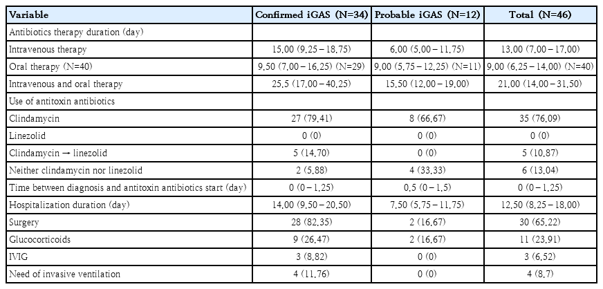Finding: Two of 46 patients with iGAS died. Nearly all received beta-lactams plus clindamycin. Linezolid was effective in refractory cases. IVIG and corticosteroids had variable efficacies.