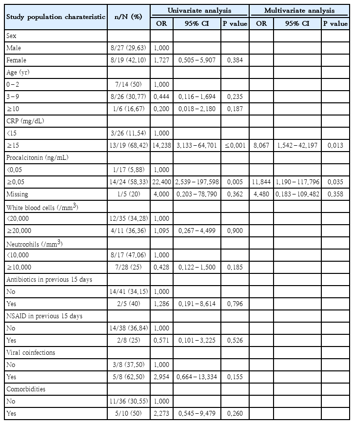 A univariate analysis (Table 3) was performed to evaluate factors potentially associated with PICU admission. Among these, positive serum PCT levels at onset (≥0.05 ng/mL) (odds ratio [OR], 22.400; P=0.005) and serum CRP levels ≥15 mg/dL (OR, 14.238; P=0.013) were significantly associated with PICU admissions. These 2 factors were subsequently analyzed in a multivariate analysis, which confirmed them as independent risk factors for PICU admission.