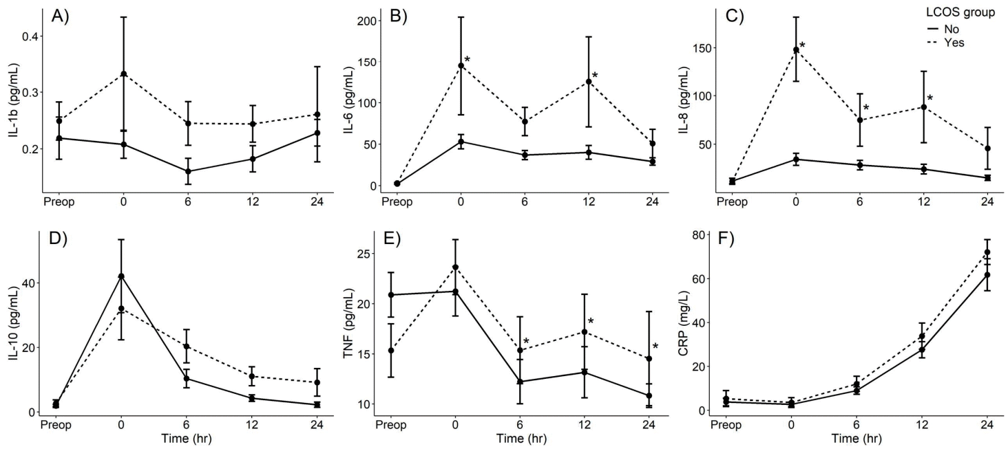 Cytokine values preoperatively and at 0-, 6-, 12-, and 24-hour post–pediatric intensive care unit admission of patients with versus without LCOS-related poor outcomes: (A) interleukin (IL)-1β, (B) IL-6, (C) IL-8, (D) IL-10, (E) tumor necrotic factor (TNF)-α, (F) C-reactive protein (CRP). The dashed line represents patients with LCOS-related outcomes, while the solid line represents patients without LCOS-related outcomes. *P<0.05 on a linear mixed-model regression analysis comparing the differences in cytokine values between the LCOS and non-LCOS groups over time. LCOS, low cardiac output syndrome.