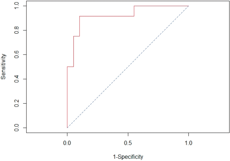 The earliest time that showed significance of each cytokine (T0 in IL-6 and IL-8 and T6 in TNF-α) was selected to calculate the delta value. The best cut off delta values identified by Youden method, were as follows: >90 pg/mL for IL-6, >56 pg/mL for IL-8 and >0 pg/ml for TNF-α. The final model of multivariable logistic regression analysis revealed that increasing levels of IL-8 at time of PICU admission of more than 56 pg/mL from preoperative and intraoperative corticosteroid administration had significant association with LCOS-related outcomes (Table 4). The AUC of this model was 0.92 (95% CI, 0.82–1.00) (Fig. 2).