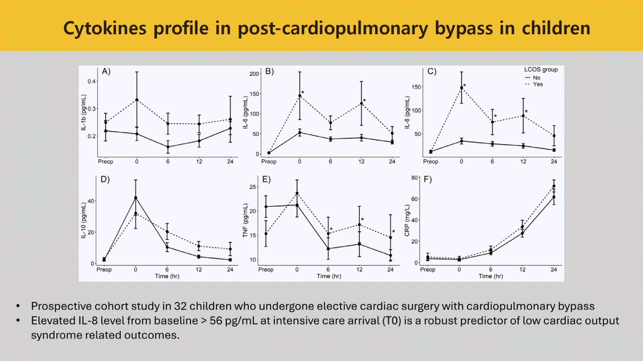 Although patient characteristics did not differ significantly between the LCOS and non-LCOS groups, patients in the LCOS group were more likely to have undergone complex cardiac surgeries, as indicated by higher RACHS scores, single ventricle physiology, and a history of previous cardiac operations. Our study reported a significant increase in all markers, except IL-1β, after bypass was performed in children undergoing open cardiac surgery. CRP was identified as a late-response marker compared to others. Significant differences were observed in IL-6, IL-8, and TNF-α levels between patients that developed LCOS and those whom did not. Notably, an increase in IL-8 > 56 pg/mL from baseline postoperation demonstrated the most significant effect on LCOS-related outcomes.