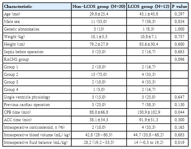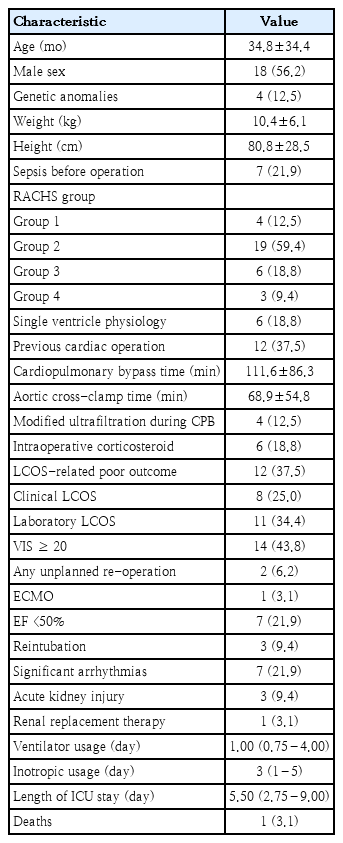 Thirty-six patients were enrolled for cardiac surgery during the study period. Three patients were excluded, due to an emergency operation, and one being unweanable CPB: leaving 32 patients for final analysis. Baseline characteristics and outcomes are summarized in Table 1. The majority of patients were male (56.2%, 18 of 32), with a mean age of 34.8 months (SD, 34.4). Nine patients (28.3%) had RACHS category ≥ 3, 12 (37.5%) had had previous cardiac surgery. Type of cardiac surgery is shown in Supplementary Table 1. The LCOS-related outcome accounted for 37.5% (12 of 32), and the hospital mortality rate was 3.1% (1 of 32). Patients who experienced LCOS-related outcomes had significantly longer duration of CPB time and lower intraoperative fluid balance than those who did not, whereas age, sex and preoperative status showed no significant differences (Table 2).