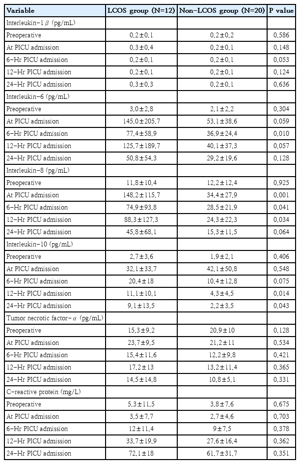 A prospective observational cohort study was conducted of 32 children who underwent elective open cardiac surgery with CPB at Songklanagarind Hospital, Thailand. Levels of interleukin (IL)-1β, IL-6, IL-8, IL-10, and tumor necrosis factor (TNF)-α were analyzed preoperatively and immediately (T0), 6, 12, and 24 hours after intensive care unit admission. LCOS-related outcomes were defined with at least two of the following criteria being met within 24 hours postoperative: clinical and laboratory parameters, vasopressor-inotropic score ≥20, ejection fraction <50% on echocardiography; and requirement for a serious postoperative intervention. Statistical analyses utilized linear mixed models and multivariate logistic regression to identify the independent predictors of LCOS.