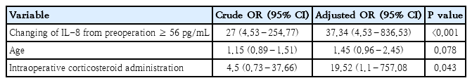 Statistical analyses involved descriptive analysis of means (standard deviations [SDs]) for normally distributed continuous data, medians (interquartile ranges [IQR]) for nonnormally distributed continuous data, and percentages in categorical data. The Student t test or Mann-Whitney U test was used for intergroup comparison of continuous data, depending on the pattern of data distribution. One-way repeated measures analysis of variance test was performed to examine the mean difference of each cytokine in overall participants. Linear mixed-model regression was used to evaluate the differences of cytokines values between the LCOS and non-LCOS groups over time. The delta value of each cytokine was calculated by the value at the first significant time point, which was identified by the linear mixed-model method minus the preoperative value: optimal cut off delta value to predict LCOS was calculated by Youden method. Baseline variables that would affect outcomes; including significant cytokines, were included in the multivariate logistic regression analysis. Multicollinearity was assessed using variance inflation factor. The final model was selected using a stepwise backward elimination method based on the likelihood ratio test and Akaike information criterion. Independent risk factors for LCOS were presented as adjusted odds ratios (ORs) with 95% confidence intervals (CI). Areas under the receiver operating curves were applied to discriminate the model performance in predicting LCOS. All analyses were conducted using R ver. 4.3.1 (The R Foundation for Statistical Computing, Austria).