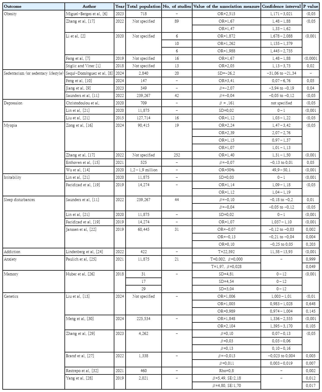The outcomes with the most evidence were organized from the highest to the lowest number of publications based on the harmful effects of screen exposure over time in the pediatric population. These outcomes include: obesity and overweight, sedentary behavior, depression and anxiety, myopia, behavioral disturbances, and sleep disturbances. The relationship between each of these outcomes and screen exposure is presented in Table 1. The analysis and discussion of the effects are presented in order of frequency, from most to least, based on the literature found, as described in the materials and methods.