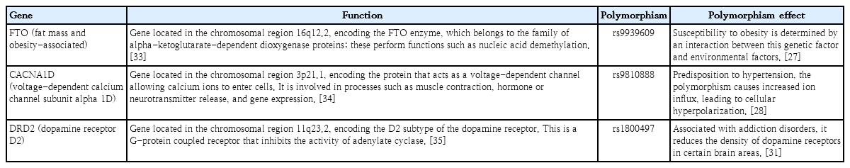 Studies regarding genetic predisposition and its association with various outcomes related to screen exposure in children are very limited. However, a relationship between single nucleotide polymorphisms (SNPs) and screen exposure outcomes such as obesity, hypertension, and ADHD was found (Table 2), the table shows the function, location, and variants of the genes. In 2007, an SNP, rs9939609 in the FTO gene (Alphaketoglutarate-dependent dioxygenase), was first described, with its role in obesity and its association with some phenotypes. A cross-sectional study conducted with children and adolescents aged 6 to 17 years in a city in Brazil found an inverse association between screen time and waist circumference (WC) (β=-0.013; CI, -0.023 to -0.004; P=0.005). Furthermore, a significant association was found between screen time and the presence of the rs9939609 polymorphism (allele A) (β=0.011; CI, 0.003 to 0.019; P=0.007) [27]. Additionally, a significant association was found between the AA genotype of the FTO polymorphism and WC in individuals who spent more than 3.8 hr/day on screens. However, no association was found in those who spent between 1 and 3 hr/day in front of screens. It was concluded that lifestyle modulates genetic predisposition to greater WC, acting as a moderating factor in the relationship between the FTO gene polymorphism and WC. It was also observed that an increase in sedentary behavior, especially in children and adolescents, was related to adverse health consequences such as body fat accumulation [27].