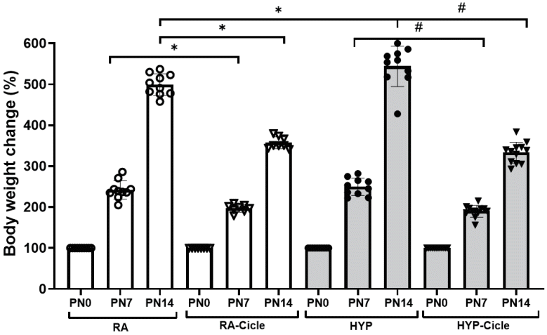 Effect of ciclesonide administration on body weight change in an experimental hyperoxia model. Values of body weight change (%) in newborn pups assigned to normoxia (room air [RA]), oxygen-enriched atmosphere-hyperoxia (HYP), or subcutaneous administration of ciclesonide during normoxia (RA-Cicle) or after hyperoxia (HYP-Cicle). PN0, postnatal day 0; PN7, postnatal day 7; PN14, postnatal day 14. Number of pups studied in each group: RA, n=10; RA-Cicle, n=8; HYP, n=10; HYP-Cicle, n=12. *P<0.05 vs. RA group. #P<0.05 vs. HYP group.