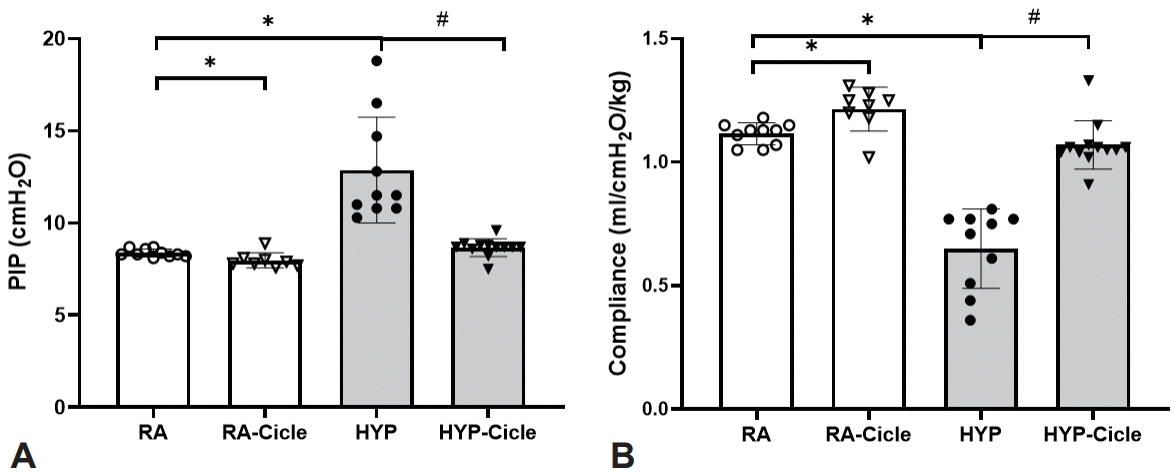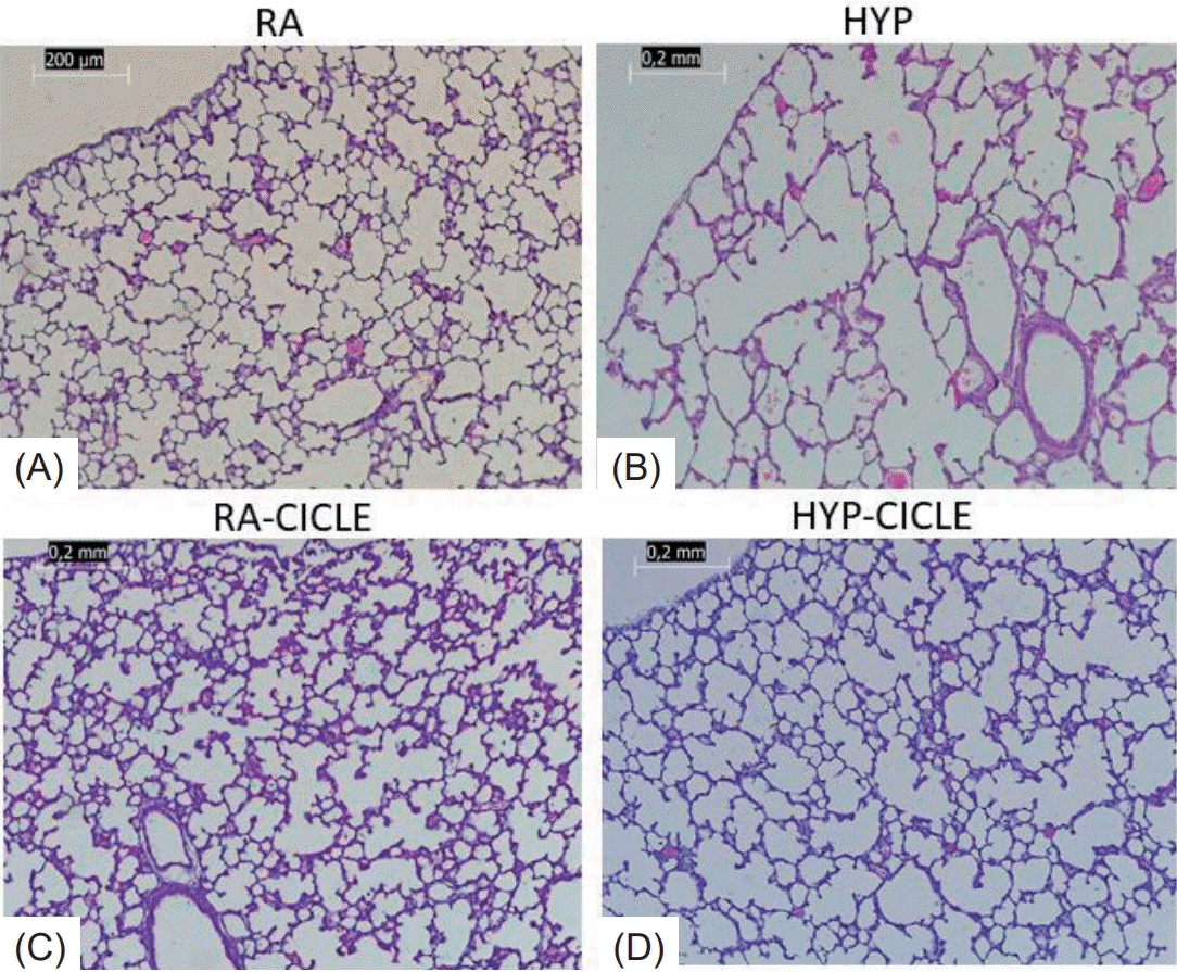 Comparing the untreated pups, at PN14, significantly higher PIP with significantly lower compliance values were observed in the HYP group than in the RA group at PN14 (Fig. 2A and B). Meanwhile, PIP and compliance in pups exposed to subcutaneous ciclesonide treatment (the RA-Cicle and HYP-Cicle groups) were better than in the RA and HYP groups.