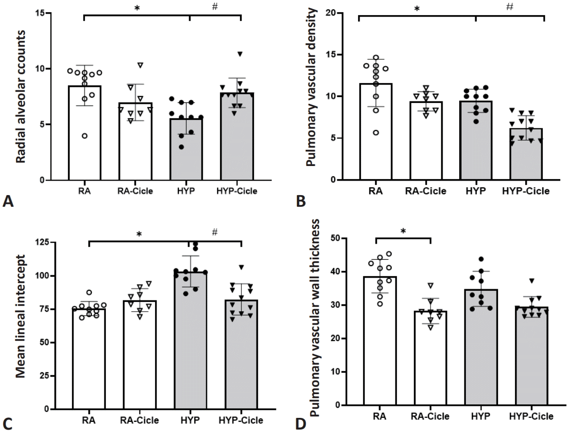 Comparing the untreated groups, at PN14, the HYP group showed less alveolarization (RAC) (Fig. 3A) and lower PVD (Fig. 3B) together with higher MLI values (Fig. 3C) than the RA group. Regarding the impact of ciclesonide treatment, the HYP-Cicle group had better RAC (Fig. 3A) and MLI (Fig. 3C) than the HYP group (Fig. 4). Further, the RA-Cicle group showed lower PVWT values than the RA group, with no differences being observed between other groups (Fig. 3D).