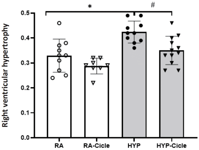 Considering the untreated groups, right ventricular hypertrophy was observed in neonatal rats exposed to hyperoxia (the HYP group) compared to the RA group at PN14 (Fig. 5). Notably, the neonatal rats exposed to hyperoxia that received ciclesonide treatment (the HYP-Cicle group) showed significantly less right ventricular hypertrophy than the HYP group at PN14 (Fig. 5).