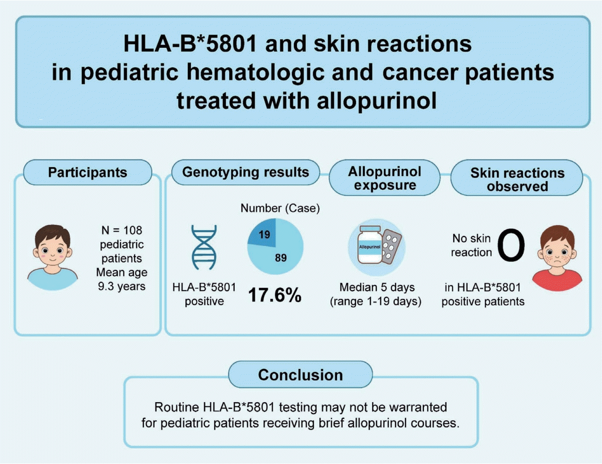 Meaning: Short-duration allopurinol may mitigate severe cutaneous adverse reaction risk regardless of genotype. Routine HLA-B*58:01 screening may be unnecessary in pediatric patients with hematological and oncological diseases briefly receiving allopurinol.