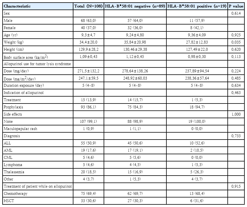 A total of 108 patients (mean age, 9.3 years) were included. Most patients (n=93, 86.1%) received allopurinol as prophylaxis for tumor lysis syndrome. Of them, 75 (69.4%) received allopurinol concomitantly with chemotherapy for malignancies, whereas the remaining patients received allopurinol during conditioning for hematopoietic stem cell transplantation. The prevalence of HLA–B*58:01 positivity was 17.6% (n=19 of 108 patients). The median exposure duration was 5 days (range, 1-19 days). No HLA–B*58:01–positive patients experienced a skin reaction. However, one patient who tested negative for HLA-B*58:01 developed a maculopapular rash on day 2 of the allopurinol therapy and required intravenous antihistamines.