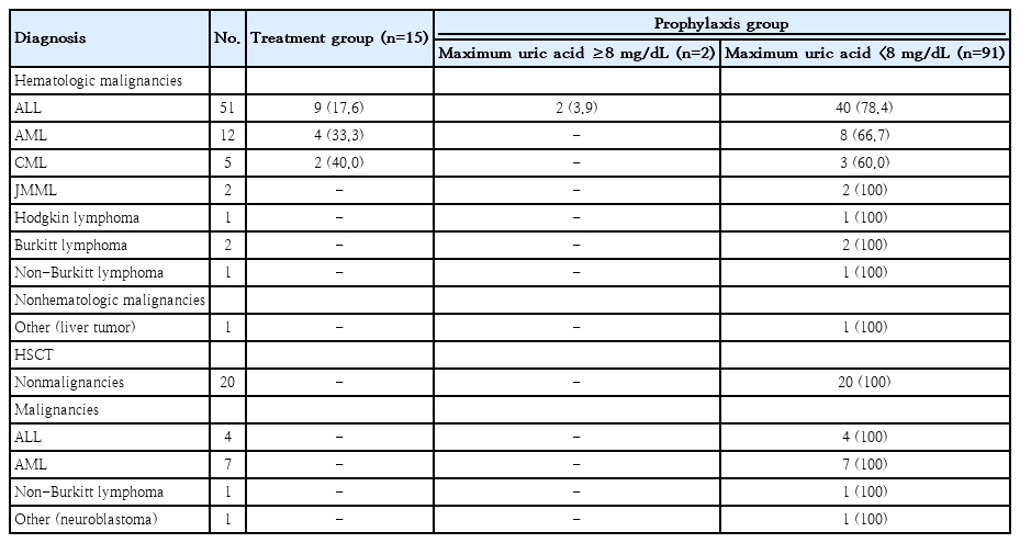 In patients with hematologic malignancies (ALL, acute myeloid leukemia, and chronic myeloid leukemia), prophylactic use was predominant, especially in ALL (82.3%). Only 2 patients with ALL (2.2% of the 93 prophylaxis recipients) had elevated uric acid levels (≥8 mg/dL) after starting allopurinol. All HSCT patients received allopurinol for prophylaxis, and none developed hyperuricemia. The indications for allopurinol therapy by diagnosis and uric acid levels were summarized in Table 2.