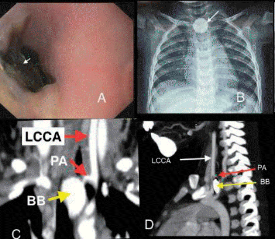 (A) Upper gastrointestinal endoscopy image showing an impacted foreign body (white arrow) in the esophagus with surrounding charred mucosa. (B) Halo sign on x-ray (anteroposterior view). (C) Computed tomography angiography (CTA; coronal section) showing the left common carotid artery (LCCA), a pseudoaneurysm (PA) (red arrow), and a button battery (BB) (yellow arrow). (D) CTA (sagittal section) showing the LCCA (white arrow), PA (red arrow), and BB (yellow arrow).