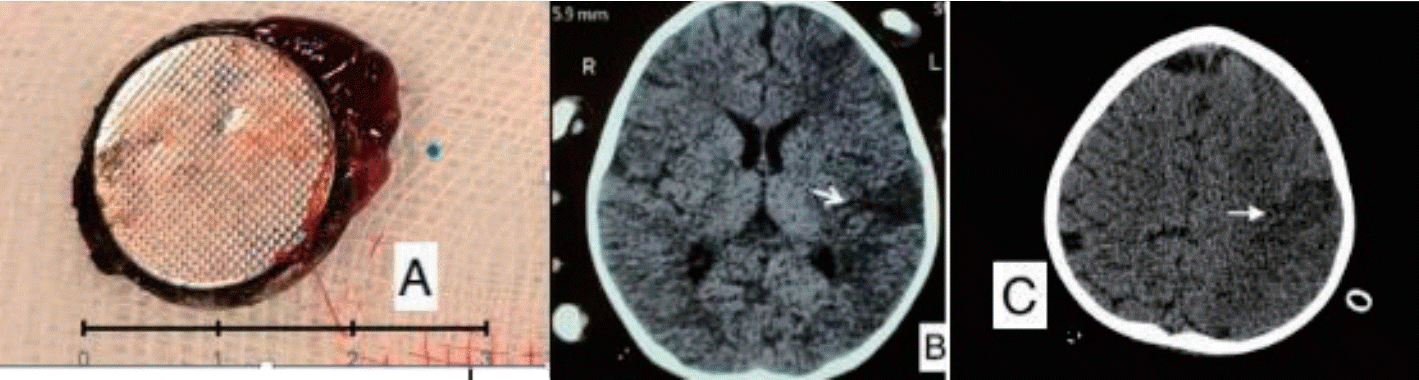 (A) Retrieved button battery (20 mm×20 mm). (B and C) Computed tomography image of the head showing a left parietotemporal infarct (white arrow).