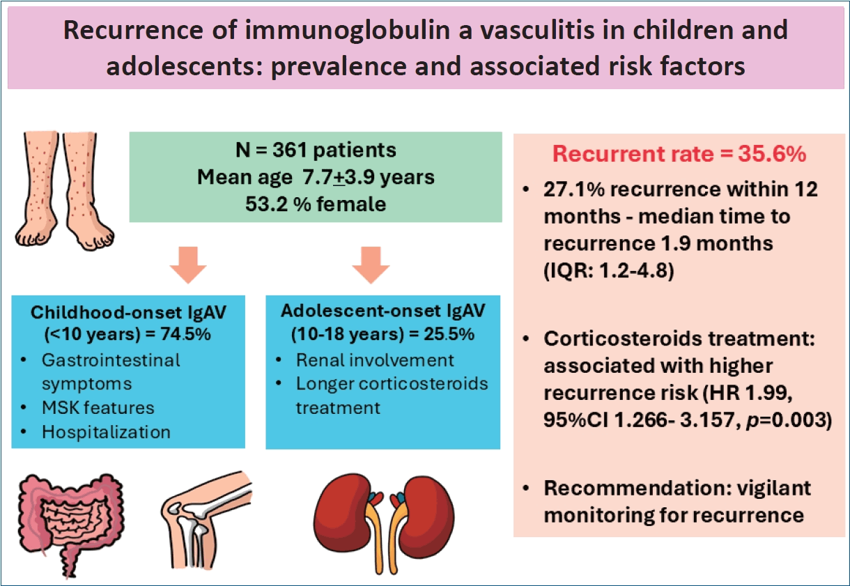 This retrospective cohort analysis included patients aged ≤18 years and diagnosed with IgAV treated in a tertiary academic center between January 2010 and December 2022. Recurrence was classified by the reappearance of purpuric/petechiae or other features that reappeared after at least 1 asymptomatic month.