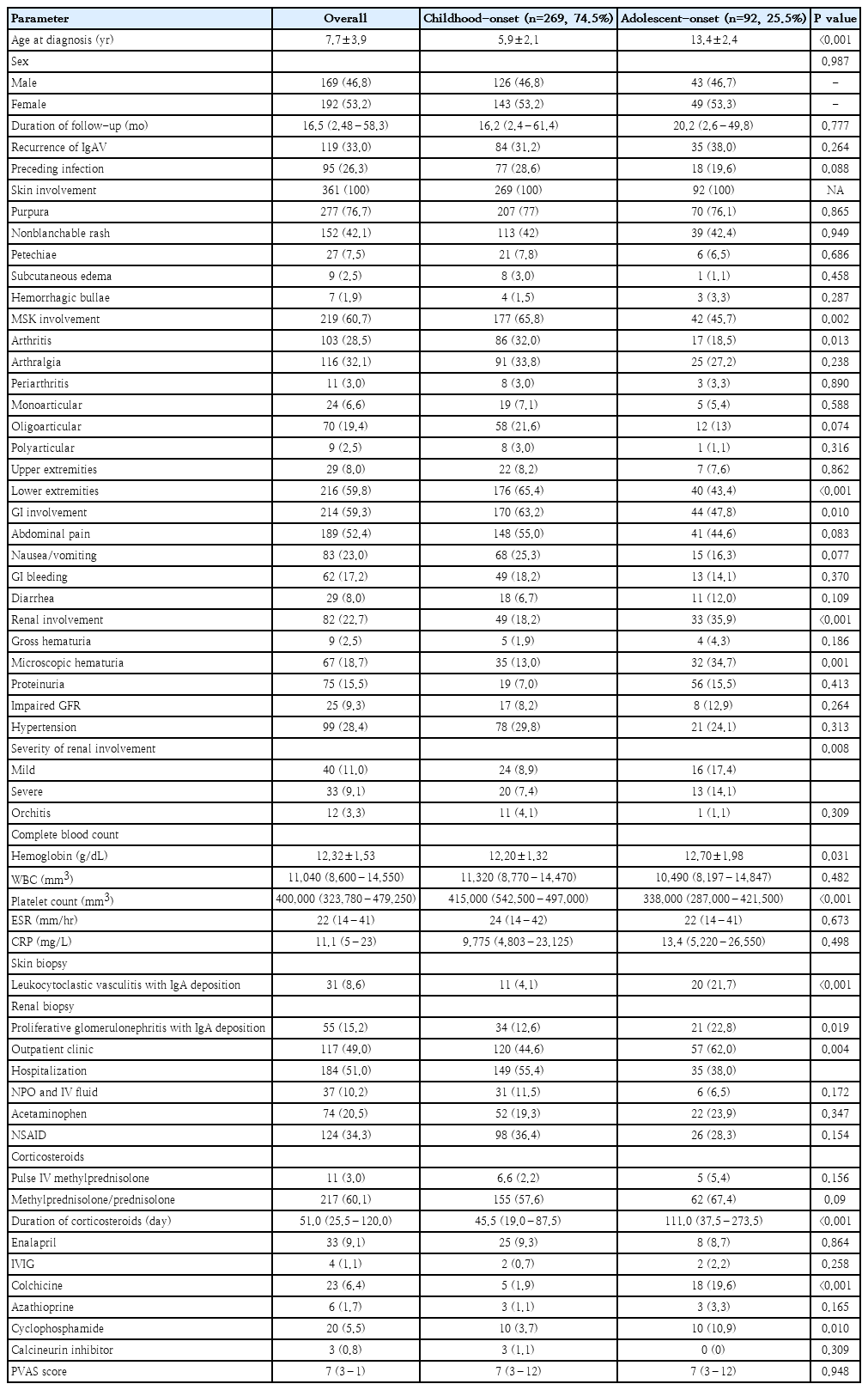The prevalence of childhood-onset (<10 years) IgAV and adolescent-onset IgAV (10–19 years) was 269 (74.5%) and 92 (25.5%), respectively. Childhood-onset IgAV had significant GI manifestation (P=0.010), MSK features (P=0.002), and required hospitalization (P=0.004). In contrast, those with adolescent-onset IgAV had significantly renal involvement (P<0.001) and required longer duration of corticosteroids treatment (P<0.001). The clinical features of all patients and the clinical features compared between childhood-onset IgAV and adolescent-onset IgAV are shown in Table 1.