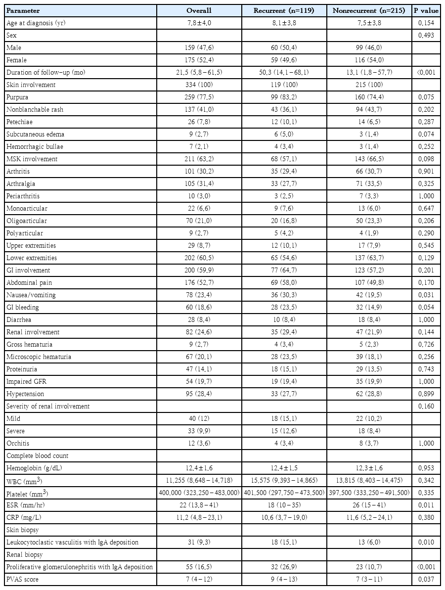 Comparative analysis of patients with recurrent versus nonrecurrent immunoglobulin A vasculitis (N=334)