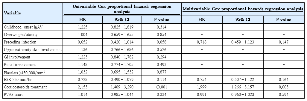 The 361 patients with IgAV had a mean age of 7.7±3.9 years; 53.2% of them were female. All patients with IgAV exhibited skin manifestations. Gastrointestinal (GI) and musculoskeletal (MSK) features were observed in 214 (59.3%) and 219 patients (60.7%), respectively. Renal involvement was observed in 82 patients (22.7%). The prevalence of childhood- and adolescent-onset IgAV was 269 (74.5%) and 92 (25.5%), respectively. Patients with childhood-onset IgAV had significant GI manifestations (P=0.01), had MSK features (P=0.002), and required hospitalization (P=0.004). In contrast, patients with adolescent-onset IgAV had significant renal involvement (P<0.001) and required a longer duration of corticosteroids treatment (P<0.001). Of the study population, 119 patients (35.6%) experienced recurrence. During the 12-month follow-up period, 98 patients (27.1%) had recurrent IgAV at a median 1.9 months (interquartile range, 1.2–4.8 months). On the multivariable Cox proportional hazards regression analysis, corticosteroids treatment was significantly associated with IgAV recurrence (hazard ratio, 1.99; 95% confidence interval, 1.266–3.157; P=0.003).