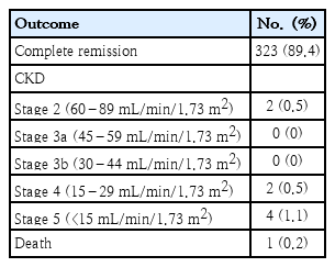 The recurrence of IgAV was classified by the reappearance of purpuric/petechiae rash [11,26] or other features that reappeared after a period of at least one month without symptoms. Proteinuria was defined as spot UPCR >0.2 mg/mg. Hematuria was classified as red blood cell >5/high-power field. Hypertension was defined if blood pressure >95th percentile according to age and sex. The GFR was calculated using a modified Schwartz formula [27]. CKD was defined as GFR<60 m L/min/1.73 m2 for >3 months [28]. IgAV with nephritis was classified according to the international study of kidney disease in children [29].