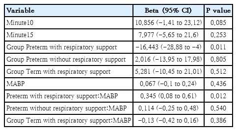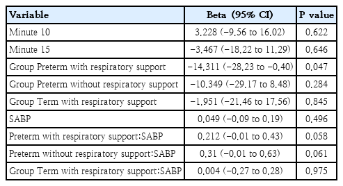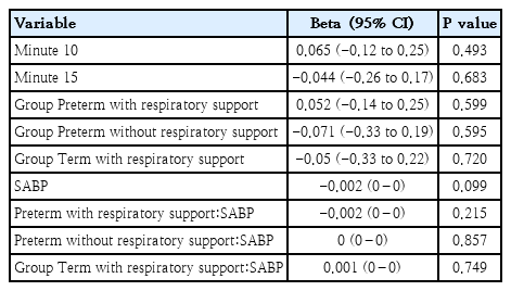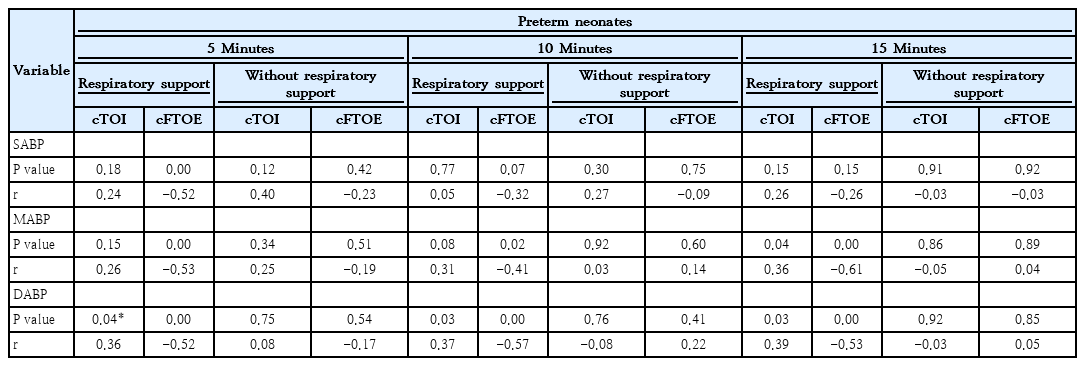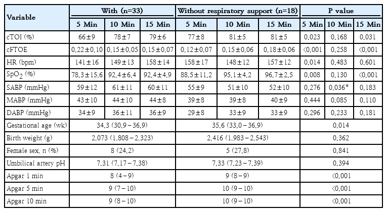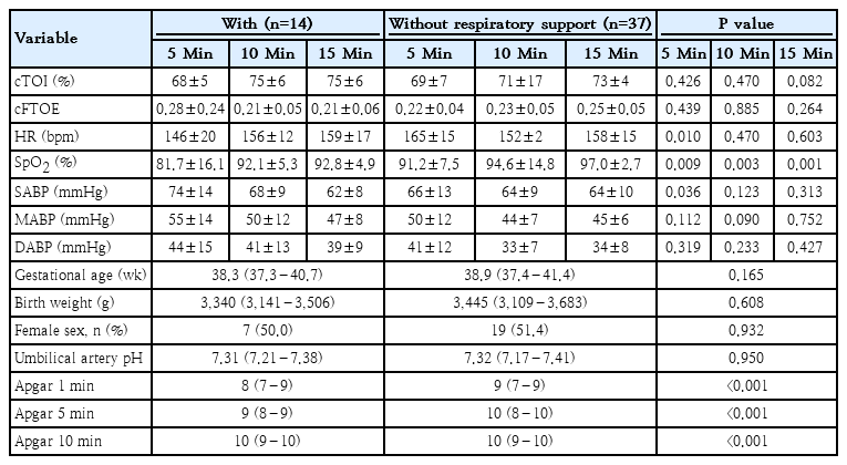Preterm neonates with respiratory support showed lower cTOI and cFTOE and HR at 5 and 15 minutes, but higher SABP at 10 minutes (Table 1). Term neonates with respiratory support exhibited significantly lower HR and higher SABP at 5 minutes (Table 2).