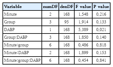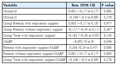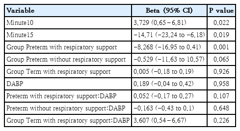 The correlation analyses showed a positive significant relationship between DABP and cTOI and a significant negative correlation between DABP and cFTOE in preterm neonates with respiratory support at 5, 10 and 15 minutes after birth (Table 3). Again, mixed models supported these findings (Table 6).