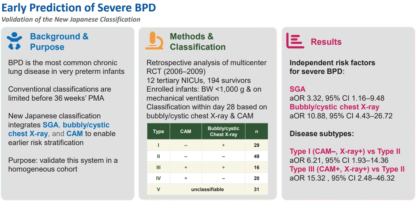 Bronchopulmonary dysplasia (BPD) is the most prevalent chronic lung disease in very preterm infants; however, conventional classifications have limited ability to predict severity before 36 weeks' postmenstrual age (PMA). A new Japanese classification, based on small for gestational age (SGA), bubbly/cystic chest radiographic findings, and chorioamnionitis (CAM), was proposed to enable earlier risk stratification. However, its validation in homogeneous cohorts is warranted.
