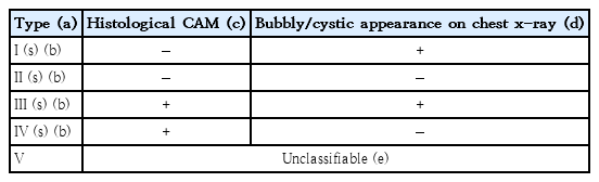 Among the 194 infants, 25 were SGA, 45 had bubbly/cystic findings, and 86 had CAM. Severe BPD occurred in 80 infants. A multivariate analysis identified SGA (adjusted odds ratio [aOR], 3.32; 95% confidence interval [CI], 1.16–9.48; P=0.032) and bubbly/cystic findings (aOR, 10.88; 95% CI, 4.43–26.72; P<0.01) as independent risk factors. Compared with type II (non-CAM, no bubbly/cystic findings), type I (bubbly/cystic only: aOR, 6.21; 95% CI, 1.93–14.36) and type III (CAM plus bubbly/cystic: aOR, 15.32; 95% CI, 2.48–46.32) were significantly associated with severe BPD.