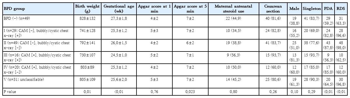Among the 194 infants analyzed, the BPD subtypes at day 28 were as follows: I (CAM [-], bubbly/cystic chest x-ray [+]; n=29, 14.9%), II (CAM [-], bubbly/cystic chest x-ray [-]; n=49, 25.2%), III (CAM [+], bubbly/cystic chest x-ray [+]; n=16, 8.2%), IV (CAM [+], bubbly/cystic chest x-ray [-]; n=20, 10.3%), type V (unclassifiable; n=31, 15.9%), and non-BPD (n=49, 25.2%). Significant differences were observed among the groups in terms of BW (P=0.01), gestational age (P<0.01), and Apgar score at 5 minutes (P=0.023). PDA frequency also significantly differed across the groups (P<0.01). Contrarily, no significant differences were observed in maternal antenatal steroid use, cesarean delivery, or sex distribution. RDS was common overall but exhibited significant variation among the subtypes (P<0.01) (Table 2).