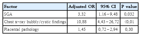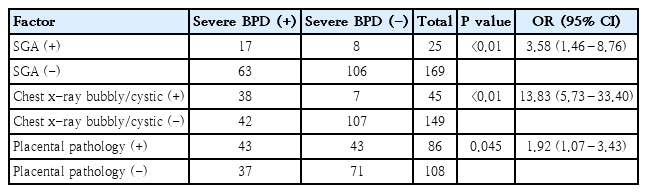 After adjustment for potential confounding factors (GA, birth weight, sex, 5-minute Apgar score, maternal steroid use, RDS, PDA), SGA status (adjusted OR [aOR], 3.32; 95% CI, 1.16–9.48; P=0.032) and bubbly/cystic findings on chest x-ray (aOR, 10.88; 95% CI, 4.43–26.72; P<0.01) remained as independent risk factors for severe BPD. Contrarily, placental pathology did not show significant association (aOR, 1.45; 95% CI, 0.72–2.94; P=0.30) (Table 4).