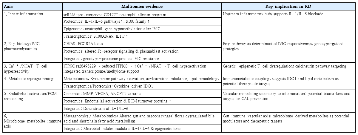 Multiomics studies have shifted the understanding of KD from a single-layer vasculitis to a network disease shaped by coordinated disturbances across genetic, immunologic, metabolic, and vascular compartments. Importantly, independent omics layers consistently highlight convergent mechanistic axes—including an IL-1/IL-6–driven neutrophil inflammatory hub (transcriptomics/proteomics), Fcγ-receptor signaling influencing IVIG pharmacodynamics (genomics/proteomics), Ca²+/NFAT-dependent immune activation (genomics/transcriptomics), and endothelial/ECM remodeling associated with coronary pathology (transcriptomics/proteomics). This cross-layer convergence strengthens biological plausibility and provides a coherent framework for interpreting clinical heterogeneity such as IVIG resistance and CAL risk.