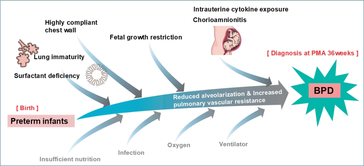 However, these new definitions of BPD at 36 weeks’ PMA mean that the diagnosis is made relatively late after birth—somewhat delayed, especially for EPIs with a lower gestational age. This limits opportunities for the early identification of infants at high risk of BPD and the implementation of early preventive interventions. To address this limitation, a Japanese group proposed a classification system that uses early postnatal factors to predict BPD [9]. According to the New Japanese Classification, BPD is diagnosed at 28 days of life and categorized into 5 groups based on 3 factors: histologically confirmed chorioamnionitis, the presence of bubbly or cystic findings on chest radiography at day 28, and small for gestational age status. In this system, being small for gestational age and the presence of bubbly or cystic findings on chest radiography at day 28 were predictive of severe BPD, as defined by the NICHD 2001 criteria, at 36 weeks' PMA. Furthermore, severe BPD was strongly associated with bubbly/cystic findings alone on chest radiography or bubbly/cystic findings combined with chorioamnionitis.