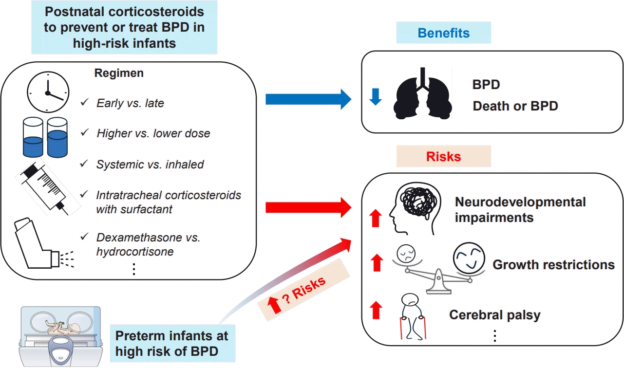 The optimal administration regimen of postnatal corticosteroids for treating or preventing BPD remains controversial. Evidence suggests that postnatal corticosteroids can facilitate ventilator weaning and reduce BPD risk; however, these benefits must be weighed against potential adverse outcomes, particularly NDI or cerebral palsy. The benefits and risks of postnatal corticosteroids vary depending on the timing of administration, corticosteroid type, dosage, route of delivery, and the infant’s baseline risk of BPD. This emphasizes the need for individualized, risk-based decision-making. Furthermore, determining whether adverse neurodevelopmental outcomes are attributable to extreme prematurity itself, BPD-associated NDI, or dexamethasone or hydrocortisone exposure remains challenging.