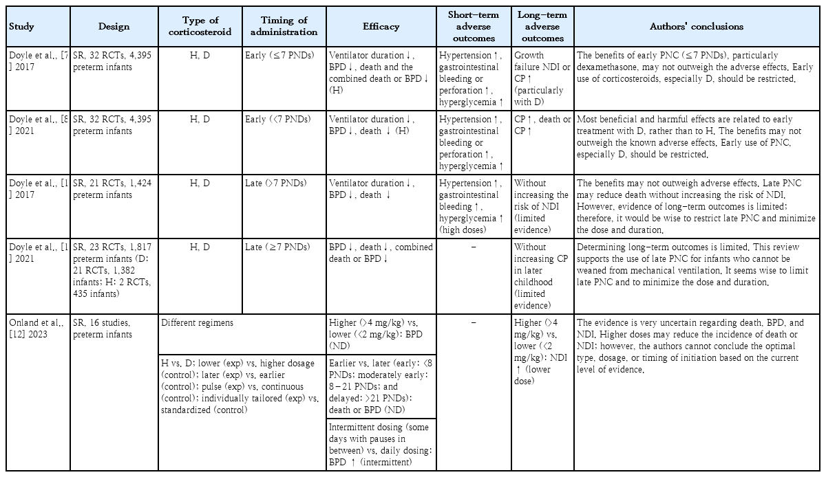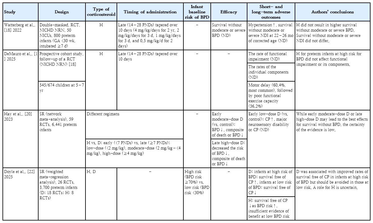 Systematic reviews have reported that the early administration of dexamethasone (within the first week of life) facilitates extubation and reduces the risk of BPD; however, it is associated with an increased risk of short-term adverse effects such as gastrointestinal bleeding, intestinal perforation, hyperglycemia, and hypertension, as well as long-term adverse effects including growth failure, NDI, and cerebral palsy (Table 1) [7,8]. In contrast, other systematic reviews have reported that the late administration of dexamethasone (after the first week of life) reduces the risk of death, BPD, and the combined outcome of death or BPD without evidence of an increased risk of long-term NDI [10,11]. These systematic reviews support the late administration of systemic corticosteroids for infants who cannot be weaned from mechanical ventilation. However, each review had limited ability to determine long-term outcomes, and none were adequately powered to detect an increased risk of NDI.