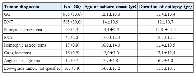 As the propensity for malignant progression is very low in LEATs, seizure control may be the main treatment target. Unfortunately, there is a high incidence of drug-resistant seizures among LEAT patients; consequently, although LEATs account for only 2%–5% of all brain tumors and are the etiology of seizures in only 1%–3% of pediatric epilepsy patients, LEATs are the second-most common reason for epilepsy surgery in children [9-12]. In a European study of brain specimens from 9,523 patients who underwent epilepsy surgery, the histopathologic etiology was identified as a tumor in 24% of all patients. LEATs comprised 82% of the tumors, and 84% of the LEATs were GGs or DNTs (Table 1).