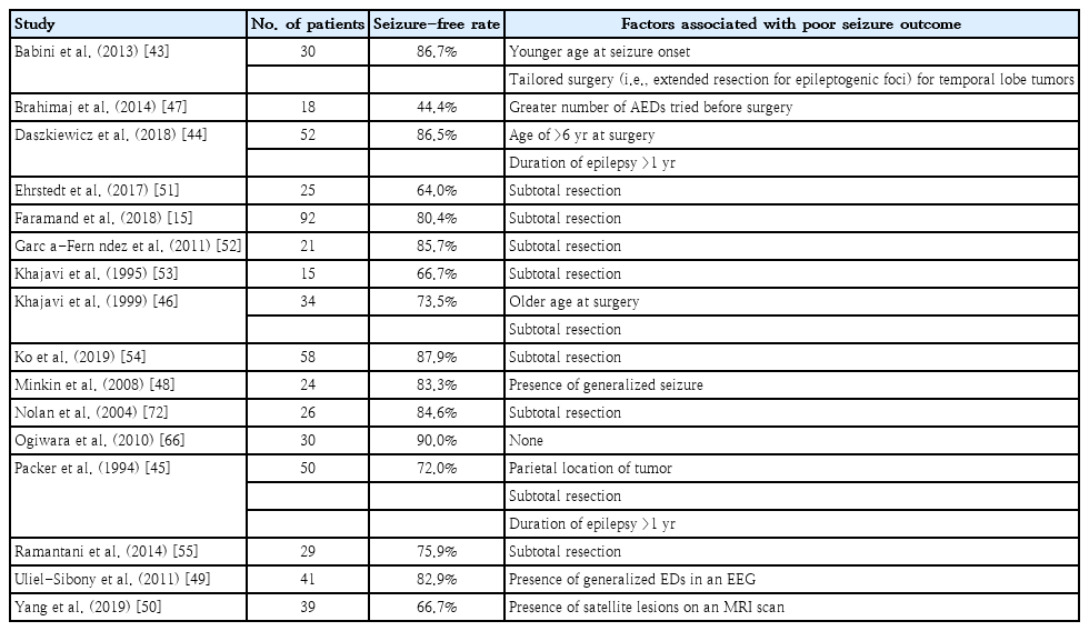 The following factors were mentioned at least once among the 16 studies that addressed seizure outcome as being predictive of seizure recurrence after surgery: younger age at seizure onset [43]; older age at surgery [44,45]; longer duration of epilepsy [44,46]; greater number of AEDs taken at the time of surgery [47]; presence of generalized seizure [48]; presence of generalized epileptiform discharges (EDs) in an electroencephalogram [49]; extratemporal or parietal location of the tumor [45]; presence of satellite lesions on a MRI scan [50]; lesionectomy of temporal tumors [43]; and subtotal tumor resection [15,45,46,51-55]. The included studies that examined seizure outcome are summarized in Table 2, and more detailed information regarding the tumor types included, parameters for seizure outcome assessment, and factors irrelevant to seizure outcome are shown in Supplementary Table 1.