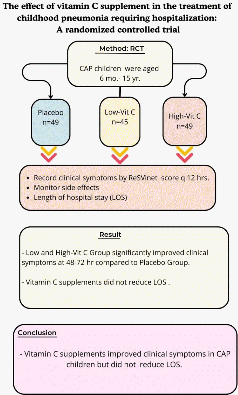 This randomized controlled clinical trial was conducted between July 2020 and October 2023. The participating patients were aged 6 months to 15 years, had CAP, and required hospitalization at Naresuan University Hospital. The patients were randomly assigned to placebo, low-dose vitamin C (15 mg/kg/dose every 6 hours), and high-dose vitamin C (30 mg/kg/dose every 6 hours) groups. Treatment was provided until discharge and doses maximized after 3 days. The patients' clinical symptoms and side effects were recorded every 12 hours.